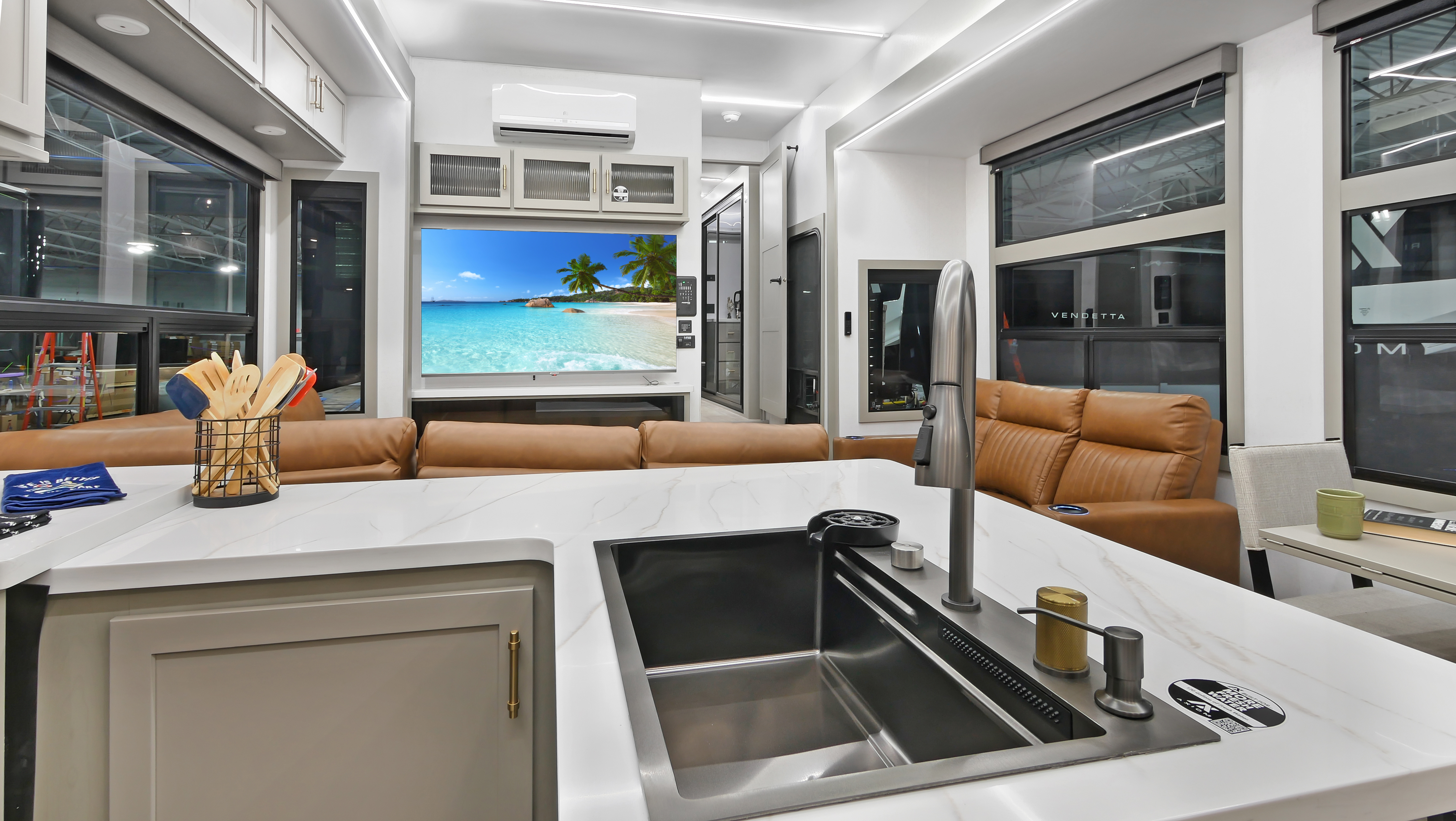 Chef’s Kitchen: A huge rear kitchen design with extensive storage and vast countertop space for true home cooking on the road.